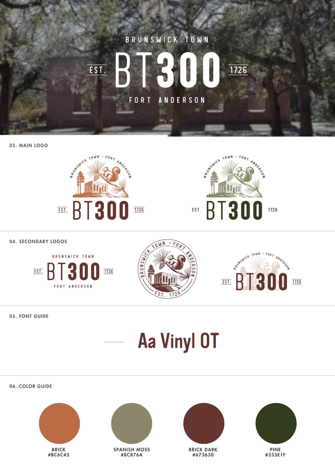 This emblem-style logo celebrates the 300th anniversary of Brunswick Town, North Carolina by blending history and nature through a bold, linocut-inspired design. In the foreground, a fox squirrel rests on a longleaf pine branch—both native symbols of the site’s natural landscape—while the background features the historic church ruins, cannon, and longleaf pines that reference Brunswick Town’s colonial past and Fort Anderson’s Civil War defenses. The arched composition evokes a sense of preservation and legacy, honoring the architecture of the historic St. James church. The emblem reflects resilience and history.