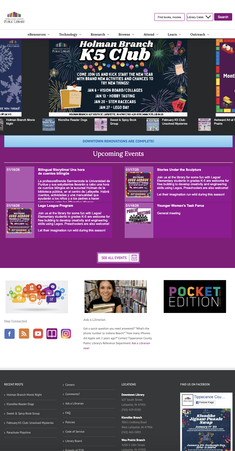 The Tippecanoe County Public Library connects the Lafayette area with entertainment, enrichment, and education. They offer classes, events, storytimes, book clubs, and much more to people of all ages and interests to encourage lifelong learning. This new visual identity captures the diversity of services available at the library, while also giving a modern rebranding to an established community treasure.